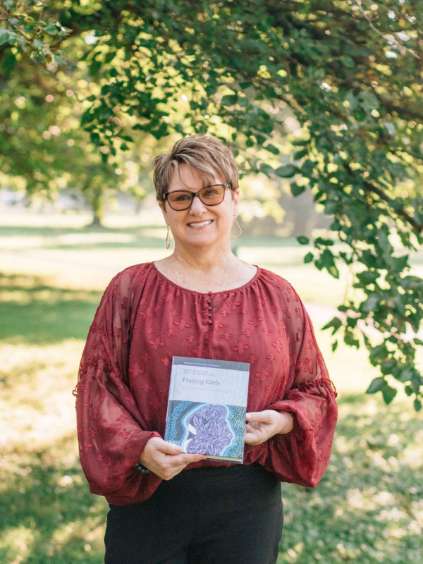 Rev. Mary Sue Barnett pictured to the right with a copy of Hating Girls: An Intersectional Survey of Misogyny